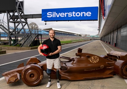 In the Silverstone pit lane where the world’s fastest cars usually undergo high-pressure tyre changes, Monger traded the smell of burning rubber for the scent of chocolate to ‘unwrap’ the giant model.